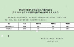 雅安市名山區(qū)茶城建設(shè)工程有限公司系雅安市名山區(qū)區(qū)屬一級(jí)國(guó)有企業(yè),成立于2018年,注冊(cè)資本2億元,主要經(jīng)營(yíng)范圍為對(duì)土地、城市資源等領(lǐng)域及保障性住房、房地產(chǎn)開發(fā)、城市基礎(chǔ)設(shè)施、公共服務(wù)設(shè)施等進(jìn)行經(jīng)營(yíng)管理;并開展項(xiàng)目投資、工程管理服務(wù)及園林綠化、環(huán)境治理、土地整理等各類工程建設(shè)活動(dòng)。根據(jù)公司2022年人員招聘計(jì)劃,茶城公司及全資子公司擬面向社會(huì)公開招聘高校畢業(yè)生3名(含2020年、2021年未就業(yè)高校畢業(yè)生和2022年應(yīng)屆高校畢業(yè)生。特別說明:“未就業(yè)高校畢業(yè)生”需同時(shí)滿足以下條件:拿到畢業(yè)證和學(xué)位證;在規(guī)定擇業(yè)期內(nèi)沒有與任何單位簽訂任何形式的勞動(dòng)合同...