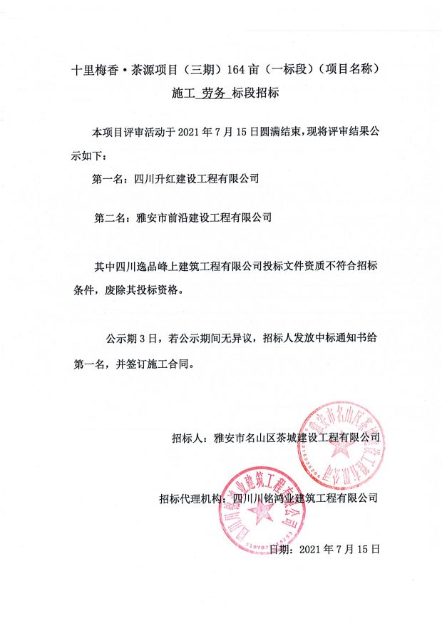 十里梅香茶源項目(三期)164畝施工總承包一標段施工勞務(wù)標段評審公告