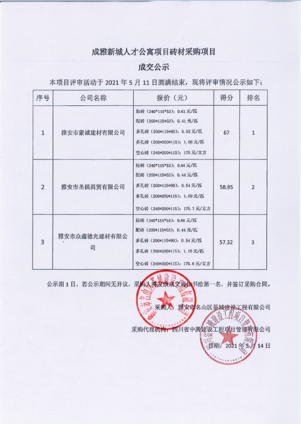 成雅新城人才公寓項(xiàng)目磚材采購(gòu)成交公示